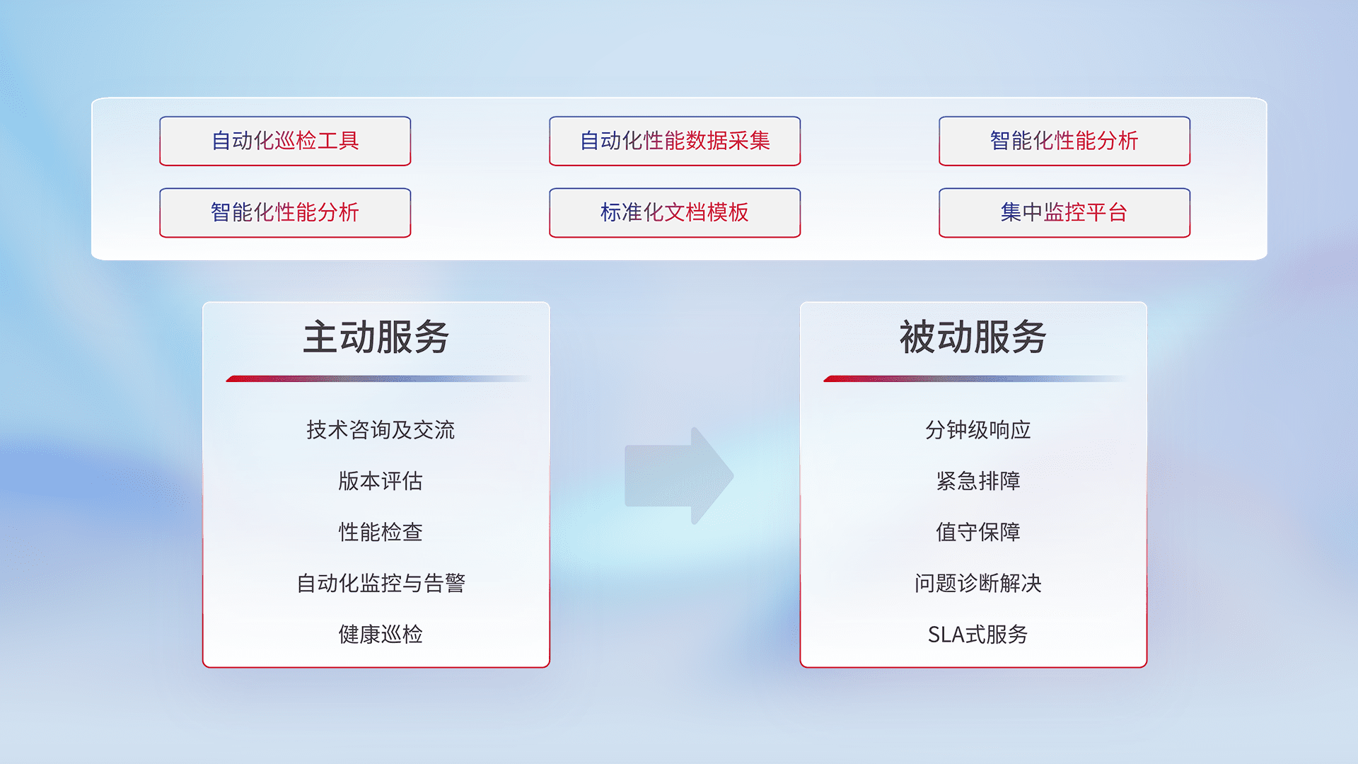智能化工具和标准化文档,,,保障服务质量,,,,提供主动服务(包含技术咨询、、、版本评估、、性能检查、、自动化监控与告警、、健康巡检)和被动服务包含(分钟级响应、、紧急排障、、值守保障、、、问题诊断解决、、SLA服务)。。。