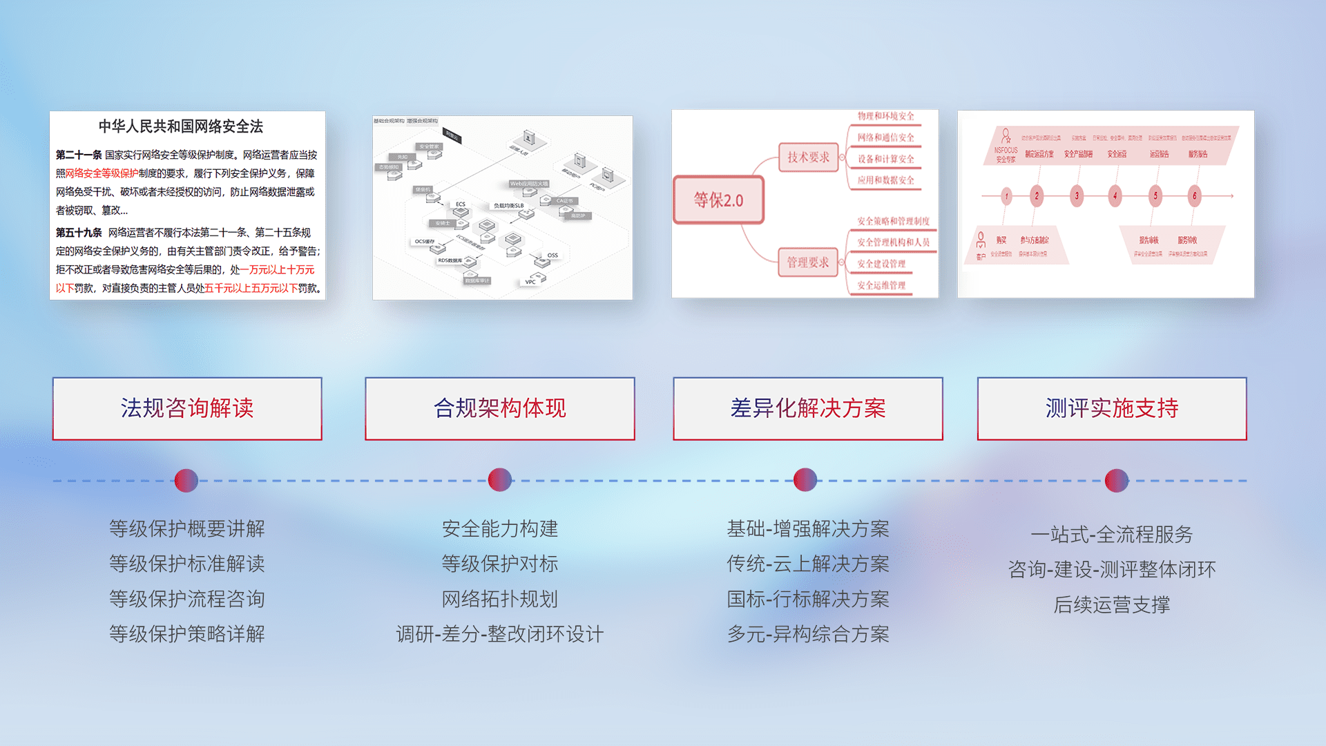 通过专业的法律咨询解读、、合规架构体现、、差异化解决方案、、、测试实施支持等服务,,,,为客户量身打造等保合规体系。。