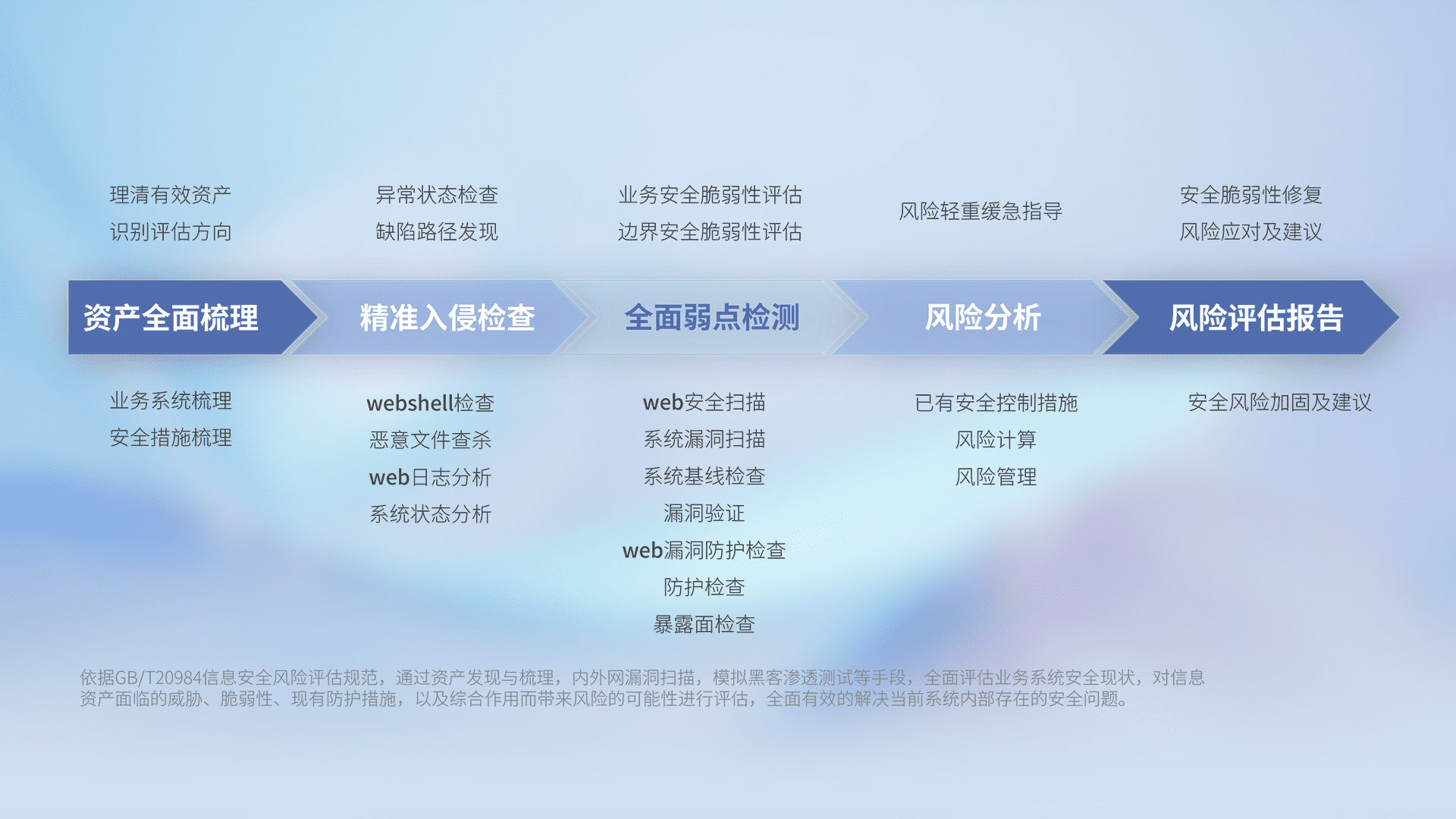 针对客户行业特性,,以专业的安全服务+多厂商联合解决方案提供专属的一站式安全管理服务,,,帮助客户全面感知网络空间威胁,,基于识别、、检测、、、分析、、防护、、、、监测、、、响应的服务理论模型,,从方案咨询、、集成交付、、评估验证、、、、优化加固、、、、运维运营,,,,致力于为客户提供完整的闭环管理式安全服务。。。。以实战经验为客户打造高抵御风险的安全体系,,,,帮助客户发现威胁、、对抗威胁、、处置威胁,,,不断积累安全对抗能力,,,,持续保障数字化安全。。。。